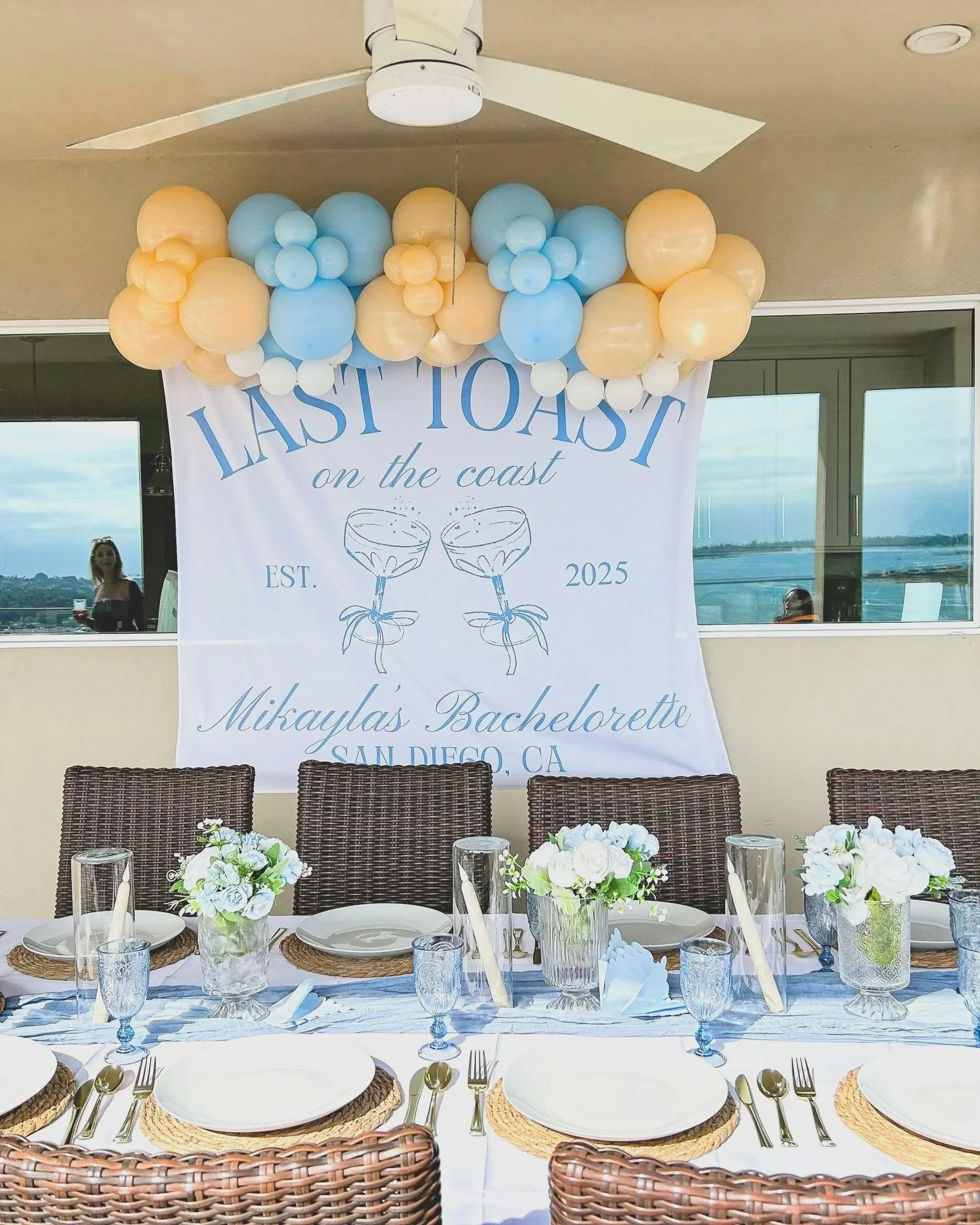 A custom printed tapestry designed around your bachelorette theme — used as a backdrop for photos, a statement piece in your suite, or a keepsake the bride takes home. Available in multiple sizes and fully personalized to your colors, theme, and vibe.
