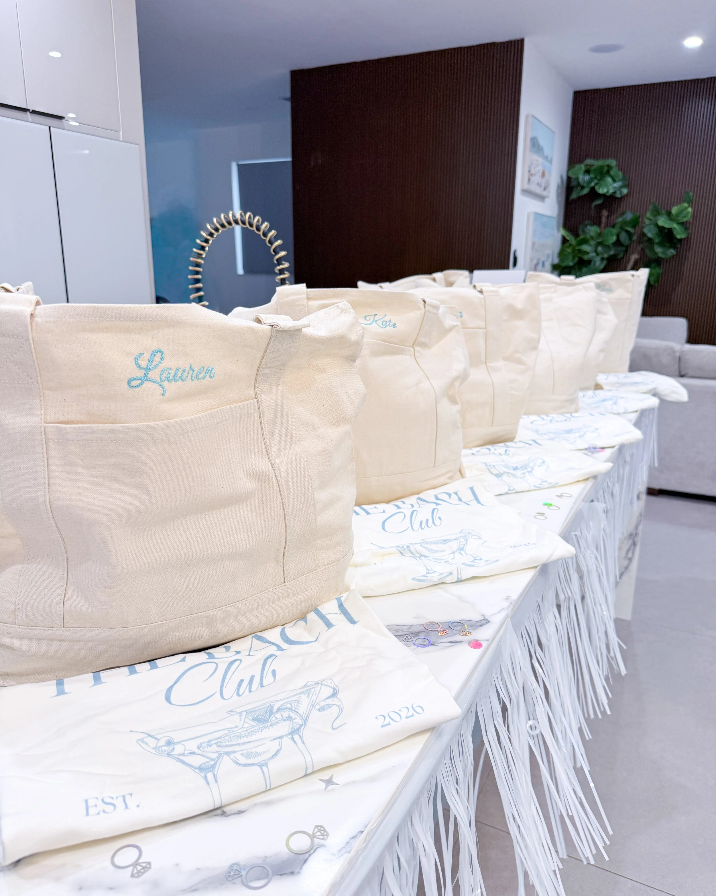 10 Premium Bach Me Bachelorette Bags ~ every guest gets their own fully personalized bag packed with a tumbler, tote bag, claw clip, scrunchie, sunglasses, and makeup mirror — all personalized with each guest's name.